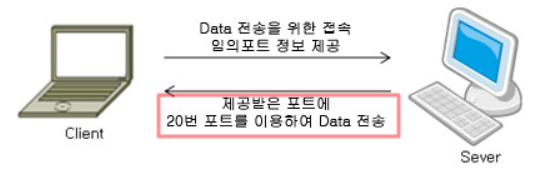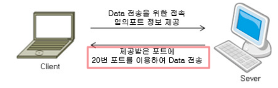 - 데이터 전송 시 능동모드와 달리 클라이언트는 서버 쪽에서 알려준 임의포트와 연결하여 데이터를 송수신하게 된다.