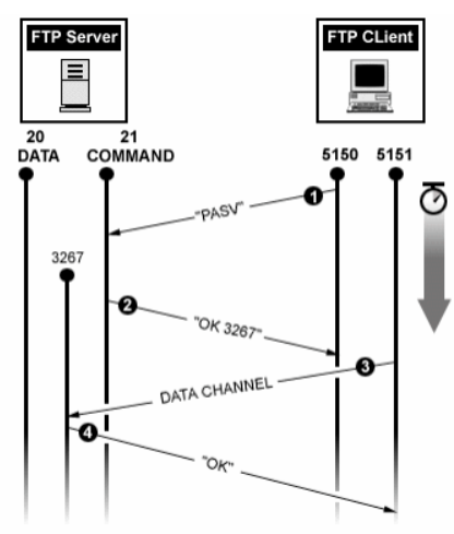 수동 모드에서는 두 번째 data포트로써 능동모드에서 사용했던 20번 포트를 사용하지 않고 1024 ~ 65535 사이의 임의의 비특권 포트를 사용한다.