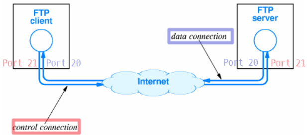 - FTP 서비스를 제공하는 서버와, 여기에 접속하는 클라이언트 사이에 두 개의 연결(세션)이 생성됨